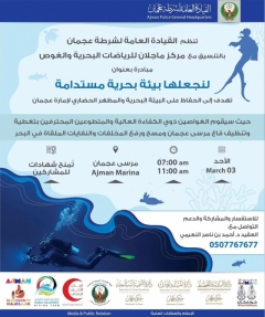 تنظم القيادة العامة لشرطة عجمان بالتنسيق مع مركز ماجلان للرياضات البحرية والغوص مبادرة بعنوان " لنجعلها بيئة بحرية مستدامة " تهدف إلى الحفاظ على البيئة البحرية والمظهر الحضاري لإمارة عجمان.