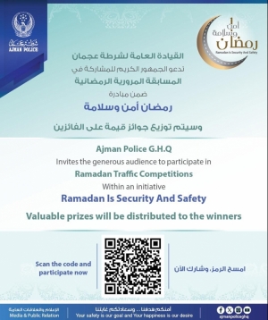 القيادة العامة لشرطة عجمان تدعو الجمهور الكريم للمشاركة في المسابقة المرورية الرمضانية ضمن مبادرة رمضان أمن وسلامة، وسيتم توزيع جوائز قيمة على الفائزين، امسح الرمز، وشارك الآن. 24/02/2026