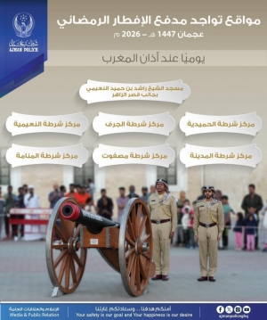 مواقع تواجد مدفع الإفطار الرمضاني عجمان 1447هـ - 2026م يومياً عند أذان المغرب 27/02/2026