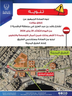 شرطة عجمان تعلن عن إغلاق مؤقت لشارع راشد بن عبد العزيز في منطقة الراشدية (2) 20/01/2026