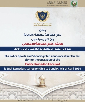 يعلن نادي الشرطة للرياضة والرماية بأن آخر يوم لعمل كرنفال نادي الشرطة الرمضاني هو 28 رمضان الموافق يوم الاحد 7 ابريل 2024