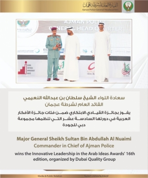 سعادة اللواء الشيخ سلطان بن عبدالله النعيمي القائد العام لشرطة عجمان يفوز بجائزة القيادي الابتكاري ضمن فئات جائزة الأفكار العربية في دورتها السادسة عشر التي تنظمها مجموعة دبي للجودة. 29/11/2023