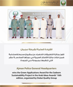 شرطة عجمان تفوز بجائزة التطبيقات الخضراء عن مشروع سديم للاستدامة ضمن فئات جائزة الأفكار العربية في دورتها السادسة عشر التي تنظمها مجموعة دبي للجودة. 29/11/2023