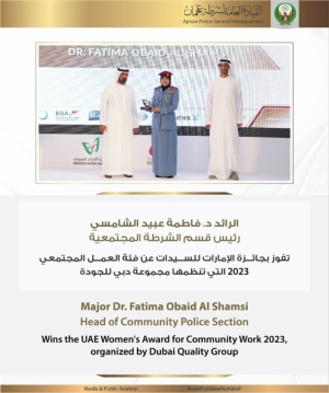 الرائد د فاطمة عبيد الشامسي رئيس قسم الشرطة المجتمعية تفوز بجائزة الإمارات للسيدات عن فئة العمل المجتمعي 2023 التي تنظمها مجموعة دبي للجودة. 29/11/2023