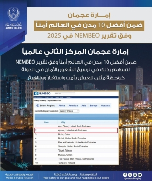 إمارة عجمان الثانية ضمن أفضل 10 مدن في العالم أمناً وفق تقرير NEMBEO في 2025