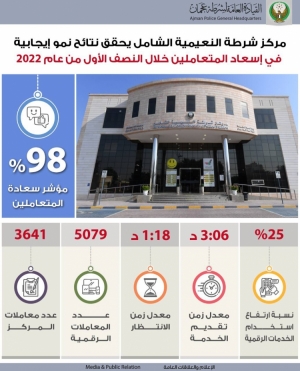 98% مؤشر سعادة المتعاملين مركز شرطة النعيمية الشامل بشرطة عجمان يحقق نموا إيجابيا في نتائج اسعاد المتعاملين خلال النصف الأول من عام 2022م