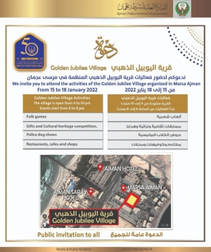 ندعوكم لحضور فعاليات قرية اليوبيل الذهبي المنظمة في مرسى عجمان من 15 إلى 18 يناير 2022 القرية والمطاعم والمعارض مفتوحة من الساعة 4 الى الساعة 10 مساءا وتبدأ الفعاليات الشعبية والمسابقات من الساعة 6 الى الساعة 8 16/01/2022