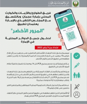 فريق الطوارئ والازمات والكوارث بامارة عجمان وبالتنسيق مع المجلس التنفيذي بالاماره يعتمدان تطبيق المرور الاخضر لدخول جميع الدوائر المحلية في الاماره 20/12/2021