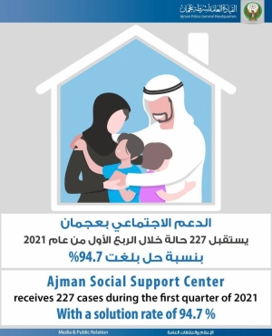 الدعم الاجتماعي بعجمان يستقبل 227 حالة خلال الربع الأول من عام 2021 بنسبة حل بلغت 94.7%