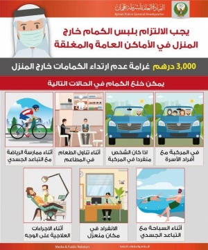 شرطة عجمان تنوه على أفراد المجتمع بضرورة الالتزام بلبس الكمام تجنبا للغرامة المترتبة التي تبلغ 3000 آلاف درهم على مخالفة خلع الكمام في الاماكن العامة والمغلقة، وتوضح الحالات التي يمكن بها خلع الكمام. 14/08/2020