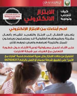شرطة عجمان تدعو أولياء الأمور إلى ضرورة حماية الأبناء من المبتزين وتوجيههم حول خطورة التواصل مع الغرباء وكيفية التعامل الأمثل مع الانترنت. 17/08/2020