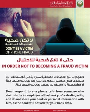 شرطة عجمان تنوه افراد المجتمع بضرورة عدم التجاوب مع أي متصل يدعي بأنه مندوب من المصرف ويطلب البيانات البنكية مع التنويه بأن المصرف لا يطلب البيانات البنكية. 18/08/2020