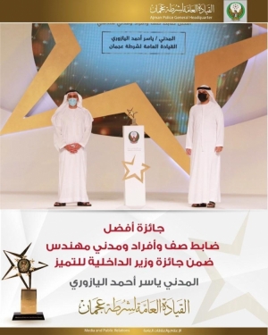 جائزة أفضل ضابط صف وأفراد ومدني ومهندس ضمن جائزة وزير الداخلية للتميز المدني ياسر أحمد اليازوري من القيادة العامة لشرطة عجمان 21/08/2020