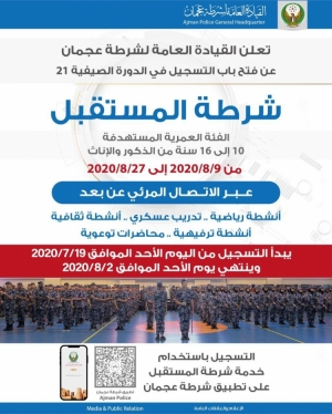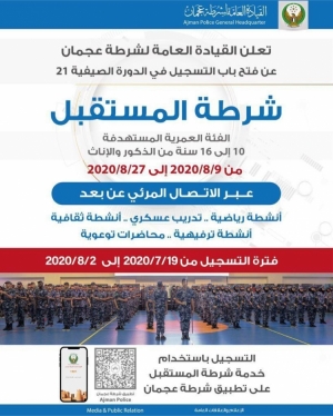 أعلنت القيادة العامة لشرطة عجمان عن فتح باب التسجيل في الدورة الصيفية 21 لشرطة المستقبل، للطلاب من الفئة العمرية من 10 إلى 16 سنة من الذكور والإناث، وتنعقد الدورة الفترة من 9/8/2020 إلى 27/8/2020، عــبــر الاتــصـال المرئي عن بعد. وتتضمن أنشطة رياضية .. ت 26/07/2020