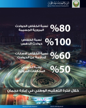 80% نسبة انخفاض الحوادث المرورية الجسيمة في عجمان و100% انخفاض حوادث الدهس خلال فترة التعقيم الوطني في عجمان 13/04/2020