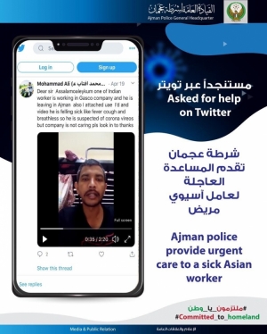 شرطة عجمان تقدم المساعدة لعامل مريض من الجنسية الآسيوية مستنجداً عبر تويتر 22/04/2020