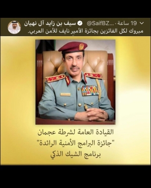 شرطة عجمان تفوز بجائزة الأمير نايف للأمن العربي فئة البرامج الأمنية الرائدة بمشاركتها بمشروع الشيك الذكي