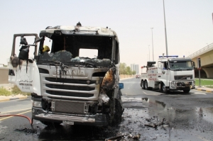 تصادم بين شاحنة ورافعة نقل نتج عنهما حريق 04/06/2015