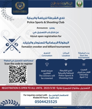 دعوة للمشاركة في البطولة الرمضانية للسنوكر والبليارد في نادي الشرطة للرياضة والرماية 23/03/2023