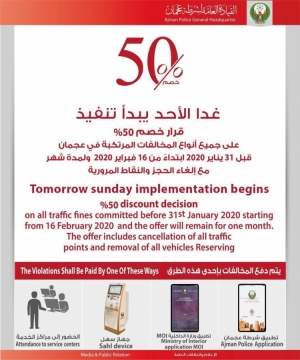 غداً الأحد تبدأ فترة تخفيض المخالفات المرورية بإمارة عجمان بنسبة 50 %