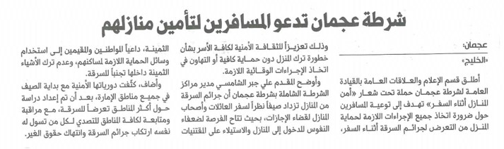 شرطة عجمان تدعو المسافرين لتأمين منازلهم