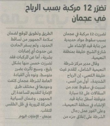 تضرر 12 مركبة بسبب الرياح في عجمان