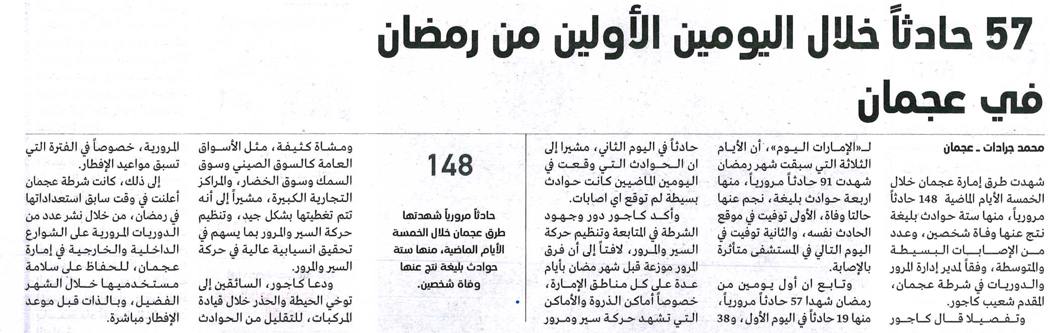 57 حادثاً خلال اليومين الأولين من رمضان في عجمان