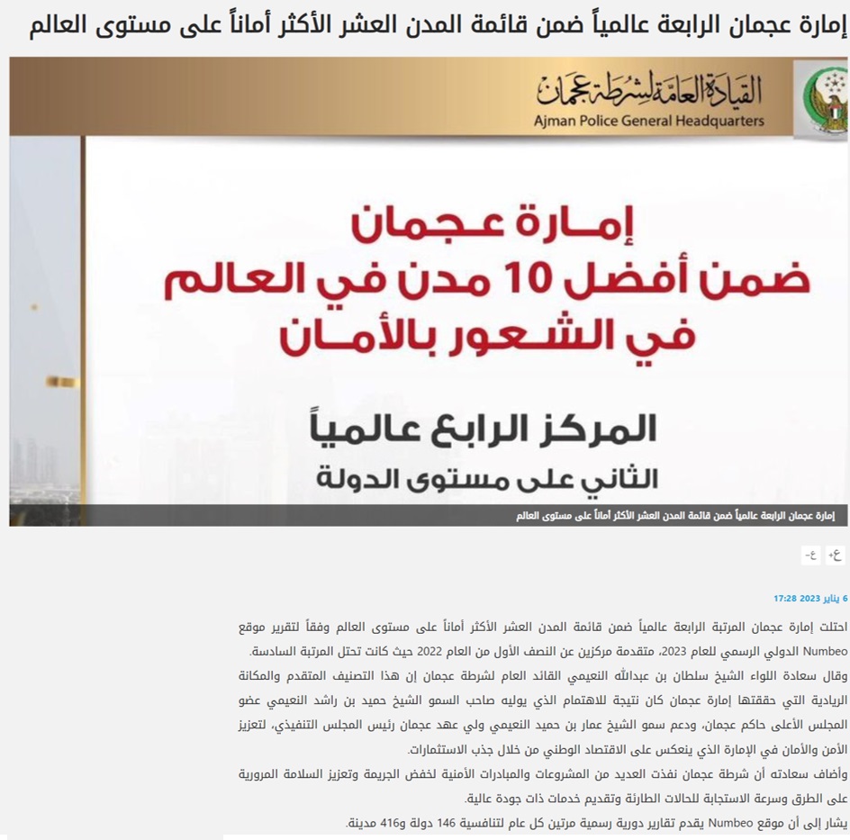 امارة عجمان ضمن أفضل 10 مدن في العالم في الشعور بالامان