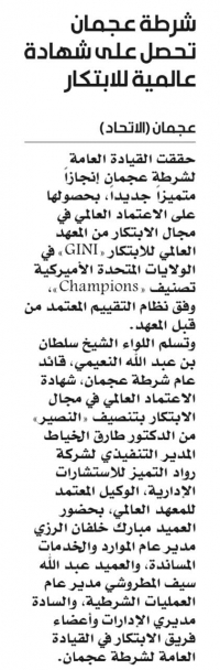 شرطة عجمان تحصل على شهادة عالمية للابتكار