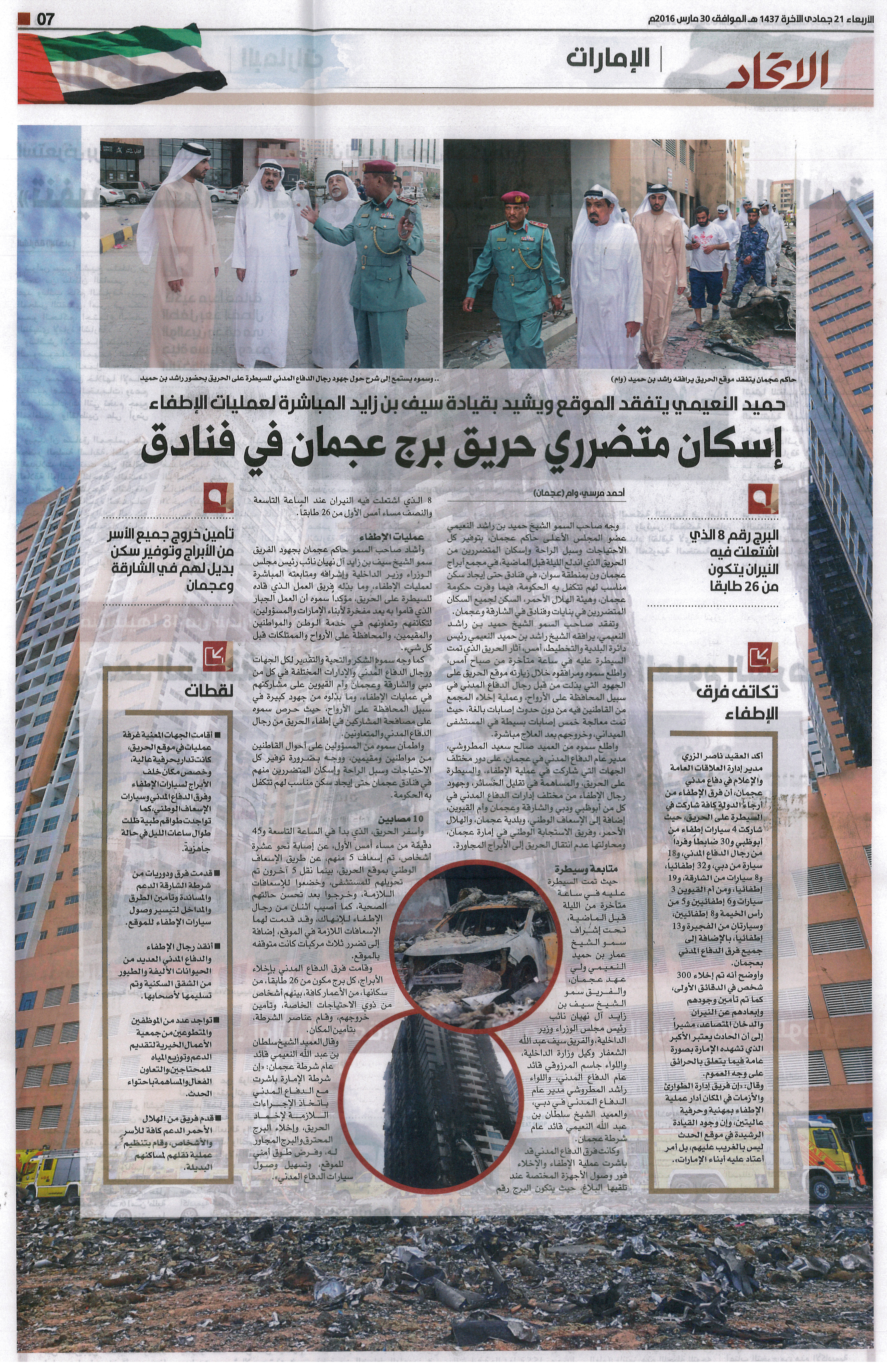 عمار النعيمي وسيف بن زايد يشرفان على إطفاء حريق في برج سكني بعجمان